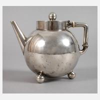 19. Jh., gestempelter Dianakopf mit Ziffer 1, Kugelform sowie auch Kugelfüße und Kugelknauf, dieser hohl gearbeitet, der Henkel ebenfalls, zwei Isolierscheiben aus Bein und Horn, der Deckel rückseitig scharniert, innen Gebrauchsspuren, der Ausguss minimalst gedellt, H 14 cm, G ca. 284 g.