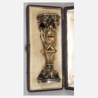 signiert und datiert 1845, Silber geprüft, feinst ziseliert und teilvergoldet, in Form einer neogotischen Säule und drei Figuren als Heiliger Georg, jeweils ein offenes Wappenschild tragend, im originalen Etui, gestempelt Franz Jauner, K.K. Hof-Wappen-Graveur, Augustinergasse, 1157 Wien, mit heller Seide und Samt ausgekleidet, der Lederdeckel floral geprägt, sehr schöner originaler Zustand ohne Monogramm, G ca. 316 g. Künstlerinfo: Hofgraveur Franz Jauner (1808–1889), auch bekannt als "Wiener Cellini".