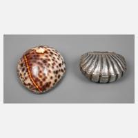 eine Schweden, Kauri-Tigerschnecke mit Silbermontierung, gestempelt mit drei Kronen und weiterer unleserlicher Punze und Hersteller GNR?, scharnierter Klappdeckel mit graviertem Besitzermonogramm SMS im Blattkranz, die andere Silber, innen vergoldet, mit Herstellerpunze PS, wohl Schwäbisch Gmünd, altersgemäßer Zustand, L 6 und 7 cm, G total ca. 93 g.