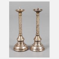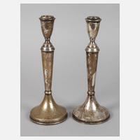 um 1900, ungemarkt, geprüft, gedreht gerippter Schaft, Dorn ebenfalls aus Silber, Fuß beschwert, einer am Boden mit Fehlstelle, Gebrauchsspuren, H je 11,5 cm.