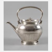 Mitte/2. Hälfte 19. Jh., gestempelter Dianakopf, Herstellermarke Juweliersfamilie Bachruch Österreich-Ungarn, ovale Form, im unteren Bereich gerippt, seitlich scharnierter Klappdeckel, beweglicher Henkel, verstärkter Ausguss, scharniergebundener Standfuß für Rechaud, Wandung etwas gedellt, sonst normale Altersspuren, H mit Henkel 30 cm, G ca. 1303 g.