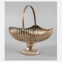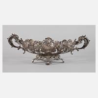 zur Silberhochzeit gewidmet 1. September 1899, im Stil des Neorokoko gestaltete Henkelschale, Silber geprüft 800, durchbrochen gearbeitet, mit Rollwerk, Rocaillen, Muschelmotiven, Blüten usw., Glaseinsatz fehlt, angelaufen, sonst schöner unbeschädigter Zustand, L mit Handhaben 36 cm, G ca. 545 g.