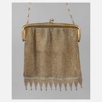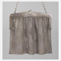 um 1925, gestempelt 800, einfacher Griff mit Kugelverschluss, die Tasche aus Silberdraht fein geflochten, gezackte Abhängungen mit Kugeln, Ösenhenkel, L mit diesem 45 cm, G ca. 246 g.