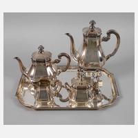 um 1920, gestempelt Sterling sowie G im Stern, vermutlich J. Grimminger Schwäbisch Gmünd, geritzte Modellnummern 11/1506, Kaffeekernstück mit zusätzlicher Teekanne, Stövchen und passendem Tablett, Isolierscheiben und Füße des Stövchen aus Bein, geringe Gebrauchs- und Altersspuren, G total ca. 3735 g.