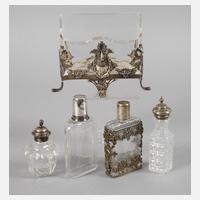 um 1900-1950er Jahre, Silbermontierungen verschieden gestempelt, Serviettenständer italienisch, Gefäßkörper aus farblosem Glas, teilweise geschliffen, ein Deckel gedellt, Glas teilweise etwas angelaufen, L max. 16 cm.