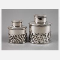 Sheffield 1933, gestempelt mit Lion Passant und weiteren Punzen, ovale Form mit abnehmbaren Deckeln, verziert mit schrägen Rippen und umlaufenden Ornamentbändern, guter Zustand, H 8 und 10 cm, G zusammen ca. 206 g.