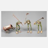 um 1900, unsigniert, Bronze polychrom in Kaltbemalung staffiert, zwei Frösche mit Schlägern und einer mit Golftasche und Fahne, alle mit kleinen Farbverlusten und minimal verbogenen Schlägern, sonst gut erhalten, H max. ca. 7,9 cm.