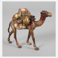 wohl 2. Hälfte 20. Jh., unsigniert, Bronze polychrom in Kaltbemalung staffiert, mit vielen Taschen bepacktes Kamel, gute Erhaltung H ca. 11 cm.