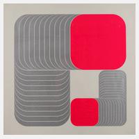 Anordnung von leuchtend roten und silberfarbenen Flächen, Farbsiebdruck auf leichtem Karton, rechts unten signiert und datiert „Lenk (19)70“ und links unten nummeriert „40/150“, auf großer roter Fläche Farbe nicht vollkommen deckend, zwischen zwei Scheiben gerahmt, Blattmaße ca. 60 x 60 cm. Künstlerinfo: dt. Graphiker und Bildhauer (1933 Berlin bis 2014 Schwäbisch Hall), Kindheit in Thüringen, 1944 Übersiedlung nach Württemberg, 1950 kurzzeitiges Studium an der Kunstakademie Stuttgart, Steinmetzlehre, 1955 Bekanntschaft zu Georg Karl Pfahler, erlangte in den 1960er Jahren durch seine Schichtungen Bekanntheit, 1968 Teilnahme an der documenta 4 in Kassel, 1970 Teilnahme an der Biennale in Venedig, 1989 Ernennung zum Professor, war Mitglied im Deutschen Künstlerbund, Quelle: Wikipedia.