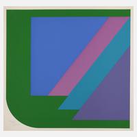 Arrangement aus violetten, blauen und grünen Flächen, Farbsiebdruck auf leichtem Karton, um 1980, rückseitig in Blei nummeriert und signiert „173/200 Pfahler“, kleine Druckspur, zwischen zwei Scheiben gerahmt, Blattmaße ca. 60 x 60 cm. Künstlerinfo: dt. Maler und Graphiker (1926 Emetzheim bei Weißenburg bis 2002 Emetzheim bei Weißenburg), ab 1948 Studium an der Akademie der Künste in Nürnberg, ab 1950 Studium an der Kunstakademie in Stuttgart bei Manfred Henninger, Willi Baumeister, Gerhard Gollwitzer und Karl Hils, 1956 zusammen mit Friedrich Sieber, Attila Biró und Günther C. Kirchberger Gründung der „Guppe 11“, nachfolgend zahlreiche Künstlerbegegnungen mit Marino Marini, Cy Twombly, Alberto Giacometti, Karl Otto Götz und Emil Schumacher, ab 1958 Loslösung vom informellen Stil zu klaren formativen Arbeiten, Werke in zahlreichen Museen und Sammlungen, Quelle: Vollmer, Wikipedia und Internet.