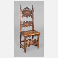 Nussbaum massiv, um 1680, Hochlehnstuhl mit breiter rechteckiger Sitzfläche, schauseitig reich beschnitzt und mit je einer intarsierten Rechteckreserve verziert, alt restauriert, Oberfläche mit schöner Patina, H 120 cm SH 48 cm.