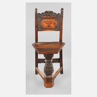wohl Österreich, um 1650, Nussbaum massiv, dreibeiniger Stuhl mit trapezförmiger Sitzfläche, das vordere Bein mit Akanthusblatt beschnitzt, die Lehne mit intarsiertem Doppeladler und beschnitzter Bekrönung, seitlich je ein Maskaron, unrestauriert, mit Alters- und Gebrauchsspuren, schöne Patina, H 103 cm, SH 49 cm.