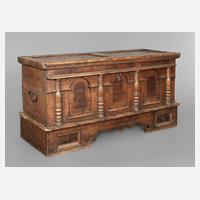 süddeutsch, Ende 17. Jh., Kiefernholz massiv, in originaler Bemalung, fassadenartig gegliederte Front durch vier Halbsäulen unterteilt, im Sockelbereich zwei kleine Schubladen, kassettierter Deckel, innen große Beilade, originales Stangenschloss, mit gravierter Schlossplatte, Schlüssel und Schließhaken fehlen, Alters- und Gebrauchsspuren, Maße 94 x 200 x 69 cm.