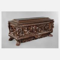 Italien, 19. Jh., aus massiver Kastanie oder Nussbaum, Front und Seiten mit aufwendig geschnitzter, figürlicher Szene, Darstellung zweier sitzender Akte, Amor mit Pfeil und Bogen sowie weitere Engel und Putten, mittig Wappentafel, blütenverzierter Sockel mit vier Löwentatzen, originales Schloss, Schlüssel fehlt, restauriert, Maße 74 x 165 x 58 cm.