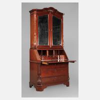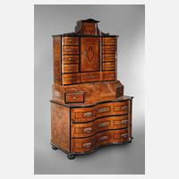 deutsch, 1. Hälfte 18. Jh., Nussbaum auf Nadelholz furniert, doppelt gebauchtes, dreischübiges Kommodenunterteil, darüber Schreibfach mit Schrägklappe, Inneneinrichtung mit vier Schüben und fünf Geheimfächern hinter Blende mit Federmechanismus (diese fehlt), Tabernakelaufsatz mit neun Schubkästen, einer Tür und Hutfach mit Schieber, Kästen mit Zentralverriegelung, alt restauriert, Alters- und Gebrauchsspuren, rest.bed., Maße 207 x 128 x 70 cm.