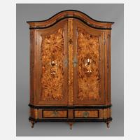 2. Hälfte 18. Jh., zweitüriger Korpus aus massiver Eiche, mit abgeschrägten Ecken, Front und Gesims mit aufwendigen geometrischen Einlegearbeiten in verschiedenen Wurzelhölzern, mittig figürliche Intarsie, Darstellung der Justitia und Fides, in brandschattierter Einlegearbeit, zum Teil in Zinn und graviertem Bein, originales Schloss und Schlüssel, restauriert, Maße 210 x 160 x 65 cm.