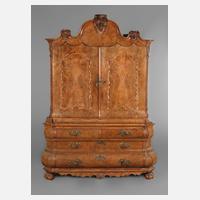 Holland, 19. Jh., komplett in Nussbaumwurzel auf Eiche furniert, zweiteiliger Korpus, das dreischübige Kommodenunterteil mit gebauchter Front, auf Adlerklauen mit Kugel, die abgeschrägten Ecken ausklappbar, dahinter je fünf Geheimfächer, Aufsatz mit drei Schüben und zwei Regalböden (zwei Schübe fehlen), Prunkbeschläge aus vergoldeter Bronze, drei original Schlüssel vorhanden, rest.bed., einige Zierteile lose beigegeben, Maße 240 x 180 x 65 cm.