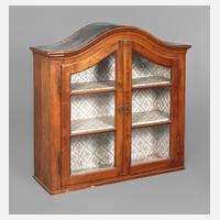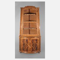 2. Hälfte 18. Jh., Nussbaum und Nussbaummaser auf Nadelholz furniert, Einlegearbeiten in Zwetschge und Ahorn, zweiteiliger Korpus, das Unterteil als Viertelzylinder mit zwei Türen, Aufsatz in verglaster Pyramidenform, mit drei feststehenden Einlegeböden, alt restauriert, Alters- und Gebrauchsspuren, Maße 253 x 125 x 81 cm.