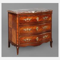 Frankreich, 2. Hälfte 18. Jh., Rosenholz und Palisander auf Eiche furniert, leicht gebauchter dreischübiger Korpus mit schwerer originaler Marmorplatte, alt restauriert, ein Beschlag und ein Schloss lose beigegeben, rest.bed., Maße 87 x 102 x 53 cm.