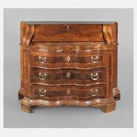um 1750, Nussbaummaser auf Nadelholz furniert, Rechteckreserven in Pflaumenholz, Fadeneinlage aus Ahorn, teilweise Eiche massiv, geschwungenes Unterteil mit fünf Schubladen, darüber Büroeinrichtung mit ausziehbarer Arbeitsplatte und acht Schubkästen, s-förmig geschwungener Rolloverschluss, die Seiten mit intarsiertem Sternmotiv, rest.bed. Maße 114 x 107 x 70 cm.