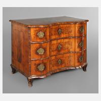 um 1740, Nussbaum und Nussbaummaser auf Nadelholz furniert, dreischübiger Korpus mit doppelt geschweifter Front, diese mit feinen Bandeinlagen verziert, originale Schlösser und Beschläge, Platte vermutlich nachfurniert, kleinere Furnierfehlstellen, restaurierungsbedürftig, ein Fuß lose, ein Stück Profilleiste lose beigegeben, H 77 x B 107 x T 59 cm.
