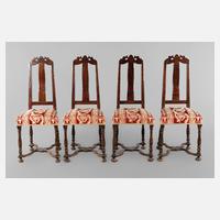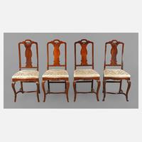 Buche massiv, auf Mahagoni gebeizt, 18./20. Jh., alle Verbindungen mit Holzdübeln, ein Stuhl original mit Ergänzungen, die anderen drei im gleichen Stil nachgebaut, wohnfertiger Zustand, Bezüge erneuert, H 110 cm, SH 50 cm.