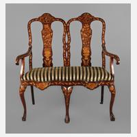 wohl Holland, 2. Hälfte 18. Jh., Mahagoni massiv und furniert, kleiner Zweisitzer mit stark gebauchter Zarge, reich verziert mit brandschattierter Intarsie, teils farbig gebeizt, Motive: zwei Amphorenvasen mit Blumen und Vögeln, umlaufend Tulpenblüten, alt restauriert, kleine Furnierfehlstellen, Bezug erneuert, Maße 114 x 110 x 46 cm.