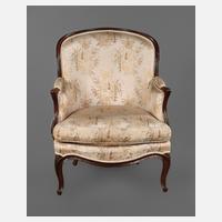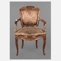 um 1770, Nussbaum massiv, stark profilierte, geschwungene Zarge und Beine, breite Sitzfläche mit hohem Federkernpolster, die kurzen Armauflagen ebenfalls gepolstert, alt restauriert, Bezug verschlissen, Maße 91 x 64 x 52 cm.