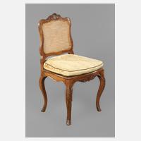 Mitte 18. Jh., Buche massiv, braun gebeizt, fast quadratische Sitzfläche auf stark geschwungenen Beinen, diese profiliert und beschnitzt, Zargeninnenseite mit schwarzer Inventarnummer, altes, vermutlich originales Geflecht, beigegeben ein Sitzkissen, Alters- und Gebrauchsspuren, H 92 cm, SH 43 cm.