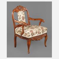 Buche massiv, Mitte 18. Jh., Armlehnsessel mit geschnitzter Zarge und Kopfbrett, Polster und Bezüge erneuert, Zarge mit alt restaurierten Wurmschäden, ein Hinterbein erneuert, H 90 cm, SH 45 cm.