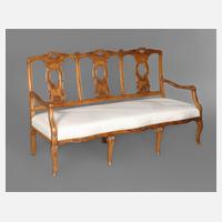 wohl Sachsen, um 1750, Buche massiv, floral beschnitzte Lehne und Zarge, Beine mit Rehfüßen, alt restauriert, Bezug erneuert, Maße 97 x 170 x 58 cm.