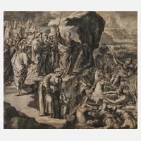 Darstellung der Szene als Moses, umgeben vom Volke Israel, seine Hand erhebt und die Wassermassen über den Ägyptern zusammenbrechen, hierzu ist in der Bibel zu lesen „Darauf sprach der Herr zu Mose: Streck deine Hand über das Meer, damit das Wasser zurückflutet und den Ägypter, seine Wagen und Reiter zudeckt!“, lavierte Tuschezeichnung mit dezenter Quadrierung, 18. Jh., im linken unteren Bereich signiert und bezeichnet „Laurentius Peracinus inv. et fecit“, geringe Erhaltungsmängel, unter Passepartout und hinter Glas gerahmt, Passepartoutausschnitt ca. 31 x 35 cm. Künstlerinfo: auch Perracino oder Peracinus, italienischer Maler und Freskant (1710 Cellio/Piemont bis 1789/90), Werke befinden sich unter anderem in den den Kirchen von Calasca, Dentro, Bognanco und Bannio, Quelle: Thieme-Becker und Internet.