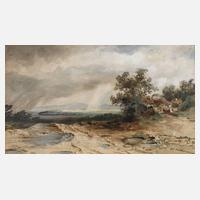 Landschaft des Voralpenlandes mit kleinem Gehöft und Regenbogen sowie vorbeiziehendem Regenschauer, Aquarell mit Weißhöhung, Mitte 19. Jh., rechts unten signiert „A. Altmann“, leichte Altersspuren, unter Passepartout und hinter Glas gerahmt, Passepartoutausschnitt ca. 15,5 x 25,7 cm. Künstlerinfo: österr. Maler und Aquarellist (1808 Wien bis 1871 Wien), Sohn des gleichnamigen Malers, verlor 1818 beiden Elternteile, Besuch der lateinischen Schule in Brünn, ab 1821 Studium an der Akademie in Wien, 1829-30 Zeichenlehrer des Grafen Joseph Apponyi, autoditaktische Beschäftigung mit der Ölmalerei, 1838 Vollendung seines ersten Ölgemäldes, 1839 Ankauf eines Gemäldes durch Franz Karl von Österreich, Quelle: Thieme-Becker und Wikipedia.