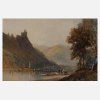 Blick über den Fluss auf eine Stadt, zu Füßen einer Burg, im Vordergrund Figurenstaffage, Landschaftsmalerei in fein nuancierter Farbigkeit, Aquarell, um 1880, rechts unten signiert „Wm Callow“, auf Blattrückseite signiert „William Callow“ und teils unleserlich bezeichnet „ … Moselle“, leichte Erhaltungsmängel, unter Passepartout und hinter Glas gerahmt, Passepartoutausschnitt ca. 27,5 x 40 cm. Künstlerinfo: englischer Landschaftsmaler, Graphiker und Aquarellist (1812 Greenwich bis 1908 Great Missenden), Lehre bei dem Maler Coply Fielding, 1825–27 Lehre bei Thales und Theodor Fielding, ab 1929 als Graveur in Paris tätig, ab 1831 Kunstlehrer der Familie von König Louis-Philippe I., 1841 Rückkehr nach London und Aufnahme in die Royal Watercolour Society, 1855 Übersiedlung nach Buckinghamshire, zahlreiche Studienreisen in verschiedene Länder Europas, Quelle: Thieme-Becker und Wikipedia.