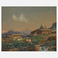 idyllischer Blick auf eine Bergwiese mit Kühen und Berghütten sowie im Hintergrund die schneebedeckten Gipfel der Alpen, teils mit spitzem Pinsel ausgeführte Malerei, Deckfarben und Aquarell, 1. Hälfte 19. Jh. , alt rückseitig bezeichnet „Ender Johann Nepomuk 1793–1854 Wien Schüler von Maurer und Lampi, sowie Caucig und Füger. Von 1829–50 Professor der Wiener Akademie“, gebräunt, hinter Glas gerahmt und hierauf Messingschild „Ender Joh. Nepom. 1793–1852 Wien“, Falzmaße ca. 20,5 x 24,5 cm. Künstlerinfo: österr. Maler und Kupferstecher (1793 Wien bis 1854 Wien), Studium an der Akademie in Wien, 1818 bereiste er mit Graf Stephan Széchény Griechenland, Italien und den Orient, ging 1820 nach Rom, 1826 Rückkehr nach Österreich und ließ sich in Wien als freischaffender Künstler nieder, 1829–50 Professor an der Wiener Akademie, 1845 Reise durch Deutschland, Belgien, England und Frankreich, Quelle: Thieme-Becker und Wikipedia.