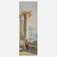 auf einer Mauer sitzender Mönch vor mediterraner Küstenlandschaft, Deckfarben auf leichtem Karton, um 1900, links unten signiert „W. Gianni“, rückseitig bezeichnet „Amalfi Nr. 37“, hinter Glas gerahmt, Falzmaße ca. 33,5 x 13,5 cm.