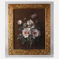 Zweige von blühenden Pfingstrosen vor dunkelbraunem Grund, detailreiche Blumenmalerei, Gouache, links unten signiert und datiert „Jules Merklen (18)90“, minimale Altersspuren, hinter Glas in mit echtem bronzierten Efeu belegten Rahmen gerahmt (mit geringen Verlusten), Falzmaß ca. 77 x 61 cm.