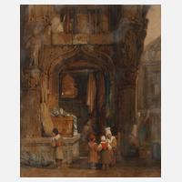 gotisches Portal mit einem Stoffhandel und Kindern, die interessiert die Ware beäugen, Aquarell und Deckweiß über Tuschezeichnung, Mitte 19. Jh., links unten signiert „Prout“, unter Passepartout und hinter Glas gerahmt, Passepartoutausschnitt ca. 31 x 26 cm. Künstlerinfo: engl. Maler, Zeichner und Lithograph (1783 Plymouth/Devon bis 1852 London-Camberwell), Kindheit in Plymouth in der Grafschaft Devonshire, ab 1803 in London, bereiste mehrfach Europa und fertigte zahlreiche Veduten, vor allem Motive aus historischen Städten in England, Deutschland, Italien, Frankreich, der Schweiz und den Niederlanden, 1829 Ernennung zum königlichen Aquarellmaler durch George IV., tätig in London, Quelle: Thieme-Becker, Wikipedia und Internet.