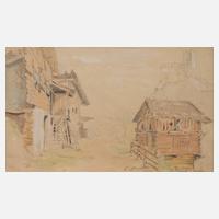 sommerliche Ansicht einer von Tiroler Bauernhäusern gesäumten Gasse zu Füßen der Burg Landeck auf hohem Fels, Mischtechnik (Aquarell und Pastell über Bleistiftzeichnung), links unten monogrammiert "L.Q." und bezeichnet "bey Landeck", rückseitig bezeichnet "L. Quaglio II. 1793/1869", gegilbt und gering fleckig, ins Passepartout eingeheftet, Blattmaße ca. 24,5 x 38 cm, Passepartoutausschnitt ca. 21,5 x 34,5 cm. Künstlerinfo: genannt Lorenzo Quaglio II. oder der Jüngere, auch Lorenz Quaglia, Qualio oder Qualia, italienischstämmiger dt. Genre-, Landschafts- und Dekorationsmaler sowie Lithograph (1793 München bis 1869 München), entstammt der seit dem Ende des 18. Jh. in München ansässigen Künstlerfamilie Quaglio aus der oberitalienischen Gemeinde Laino, Schüler seines Vaters Joseph [Guiseppe oder Giuseppe] Quaglio (1747–1828) und seines Bruders Angelo Quaglio (1778–1815), studierte ab 1809 an der Akademie München, ab 1812 einige Jahre Dekorationsmaler am Hoftheater München, ab 1834 im Auftrag von Kronprinz Maximilian von Bayern mit seinem Bruder Johann Dominicus Quaglio verantwortlich für den Wiederaufbau und die Ausgestaltung des Schlosses Hohenschwangau bei Füssen nach Plänen Moritz von Schwinds, erhielt eine Pension des Königs Maximilian von Bayern, tätig in München, Quelle: Thieme-Becker, Saur "Bio-Bibliographisches Künstlerlexikon", Matrikel der Münchner Akademie, Bruckmann "Münchner Maler des 19./20. Jh.", Benezit, Müller-Singer, Müller-Klunzinger, Seubert, Nagler, Boetticher und Internet.