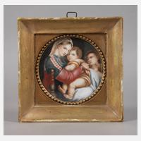 verkleinerte Kopie nach dem Gemälde von Raffael „Madonna della Seggiola“ aus dem Jahre 1513–14, Tempera, 19. Jh., minimale Verluste in der Malschicht, als Tondo gerahmt, Sichtmaß ca. 11,5 cm.