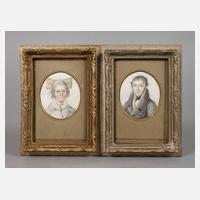 Bildnisse des Ehepaars Zeilinger, dabei Brustbildnis der Barbara Zeilinger mit Haube und Spitzenkragen im 46. Lebensjahr, dazu Brustbildnis des Erhard Zeilinger im Gehrock im Alter von 43 Jahren, mit großer Wahrscheinlichkeit handelt es sich um den Augsburger Glockengießermeister und Landwehrmann Erhard Zeilinger, welcher unter anderem die Glocken der Pfarrkirche St. Bartholomäus in Wollomoos goss und der am 24.01.1857 in Augsburg verstarb und seine Ehefrau Regina Barbara Zeilinger, welche im März 1832 in Augsburg verstarb, feine hochovale Zeichnungen mit sparsamem Kolorit, unsigniert, rückseitig datiert 1823 und je Angaben zur dargestellten Person, hinter Glas und Passepartout gerahmt, Passepartoutausschnitt je ca. 7,5 x 6,5 cm.
