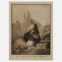 junge, am Feuer sitzende Frau mit freundlichem, dem Betrachter zugewandtem Blick, unter der Darstellung bezeichnet „Qui veut voir ma petite Marmotte“, lavierte Tuschezeichnung, 1. Hälfte 19. Jh., minimale Altersspuren, hinter Glas gerahmt, Darstellungsmaße ca. 19 x 15,2 cm, Blattmaße ca. 26,5 x 19 cm.
