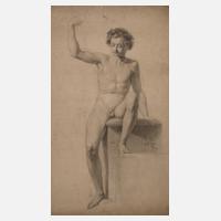 auf einem Podest sitzender nackter Knabe mit erhobener Hand, Bleistiftzeichnung mit partieller Weißhöhung, rechts unten signiert, datiert und bezeichnet „L. Schulz 1864 Roma“, rückseitig angelegte Aktstudie, geringe Erhaltungsmängel und Einrisse im Randbereich, gerollt, Blattmaße ca. 49 x 30 cm.