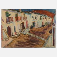 lange Gasse mit weiß getünchten niedrigen Häusern unter blauem Himmel, Aquarell, um 1960, rechts unten signiert "E. Balwé-Staimmer", gering fleckig und gegilbt, hinter Glas und Passepartout gerahmt, Passepartoutausschnitt ca. 51 x 71 cm. Künstlerinfo: geborene Elisabeth Staimmer, ab 1927 durch Heirat Balwé-Staimmer auch Balwe, dt. Malerin und Zeichnerin (1896 Straubing bis 1973 Traunstein), ab 1923 Schülerin der Münchner Lehrwerkstätten bei Karl Kaspar, studierte 1924–27 an der Münchner Kunstgewerbeschule bei Richard Riemerschmid und Else Jaskolla, 1927 freie Mitarbeiterin von Karl Kaspar und Heirat mit dem Maler Arnold Balwé, anschließend in Feldwies am Chiemsee tätig, 1931 erste Ausstellung bei der „Neuen Sezession“ München und Verlust dreier Bilder beim Brand des Glaspalastes, unternahm zahlreiche Studienreisen nach Italien, Frankreich, Spanien und Holland, beschickte Ausstellungen in München, Aachen, Köln, Stuttgart und Mannheim, Mitglied der „Neuen Gruppe“, Quelle: Vollmer, AKL, Saur "Bio-Bibliographisches Künstlerlexikon", Bruckmann "Münchner Maler des 19./20. Jh." und Internet.