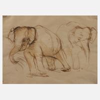 Darstellung zweier gehender Elefanten, mit lockerem Strich erfasste Tierzeichnung, teils lavierte Tuschefederzeichnung, um 1930, rechts unten zweimal signiert „v. Block-Quast“, etwas fleckig, unter Passepartout und hinter Glas gerahmt, Passepartoutausschnitt ca. 23,5 x 31 cm. Künstlerinfo: dt. Malerin, (1906 Hamburg bis 1984), Besuch der Kunstschule in Hamburg, Studienreisen nach Frankreich und Italien, Quelle: Vollmer.