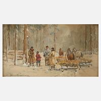 Jagdgesellschaft mit Pferdeschlitten im schneebedecktem Wald, Aquarell und Deckweiß, um 1930, links unten signiert „E. Butowicz“, leicht gebräunt, hinter Glas gerahmt, Sichtmaße ca. 18 x 30,5 cm. Künstlerinfo: polnischer Maler des 20. Jh.