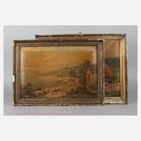 Rahmen um 1870, aus ca. 5 cm breiter, unterschiedlich steigend profilierter versilberter und auf Goldton schellackpatinierter Holzleisten, Rahmenrücken original ockerfarben gefasst, Gehrungen geschnitten, Erhaltungsmängel, original beigefügt "Kinder unterm Sonnenschirm" bzw. "Sommerliche Flusslandschaft" als Chromolitho, Falzmaße ca. 45 x 60 cm und 42 x 59 cm.