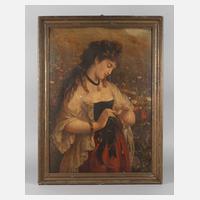 Rahmen um 1870, aus ca. 6 cm breiter, steigend profilierter, ursprünglich versilberter und auf Goldton schellackpatinierter Holzleiste, Rahmenrücken original ockerfarben gefasst, Gehrungen geschnitten, patinierte Versilberung sekundär mit Goldbronze übergangen, Erhaltungsmängel, original beigefügt Mädchenportrait als Chromolitho, Falzmaße ca. 80 x 58 cm.