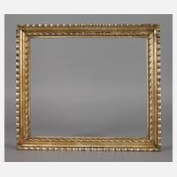 um 1880, Rahmen aus ca. 16 cm breiter, stark steigend profilierter, mit Lorbeerfries, Akanthusblattfries, Perlstab und lesbischer Kymation gestuckter und vergoldeter Holzleiste, Gehrungen über Eck gearbeitet, Rahmenfalz alt erweitert, etwas restaurierungsbedürftig, originale Falzmaße ca. 51 x 47 cm.