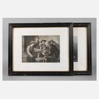 Rahmenpendants um 1880, aus ca. 4,5 cm breiter, profilierter und schwarz gefasster Holzleiste mit schmaler versilberter und in Goldton schellackpatinierter Innenkante, Gehrungen geschnitten, Erhaltungsmängel, je original beigefügt Fotogravüre "Hochseefischer" bzw. "Grasobern" (fleckig) hinter Glas als Beigabe, Falzmaße je ca. 44 x 54 cm.